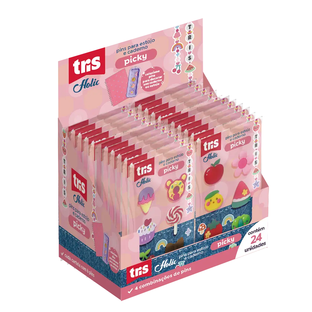 Inspirada nos pingentes e miçangas que estão em alta, a coleção Charm conta com cores alegres e design divertido. É perfeita para customizar e criar memórias especiais com os amigos! Os pins Picky são colecionáveis! Disponíveis em 4 variações de cartelas com 6 pins cada, são perfeitos para o uso em nosso estojo e caderno Picky!